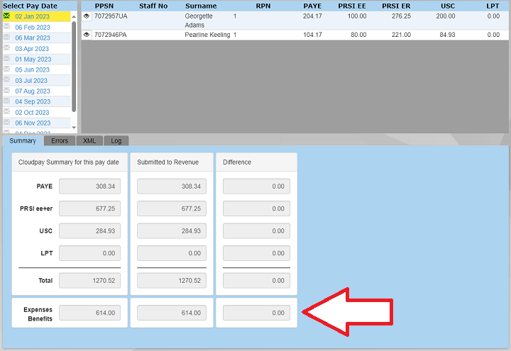 If there are any expenses or benefits recorded in the Payroll screen, these are automatically submitted to Revenue, along with the usual payroll submission, in the submission screen.