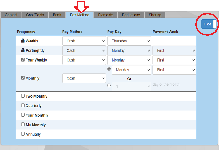 Payment frequencies are set up in the Pay Method tab of the Company screen. The most common frequencies are displayed by default but by clicking the 'Show' slider (circled) more frequencies are shown.