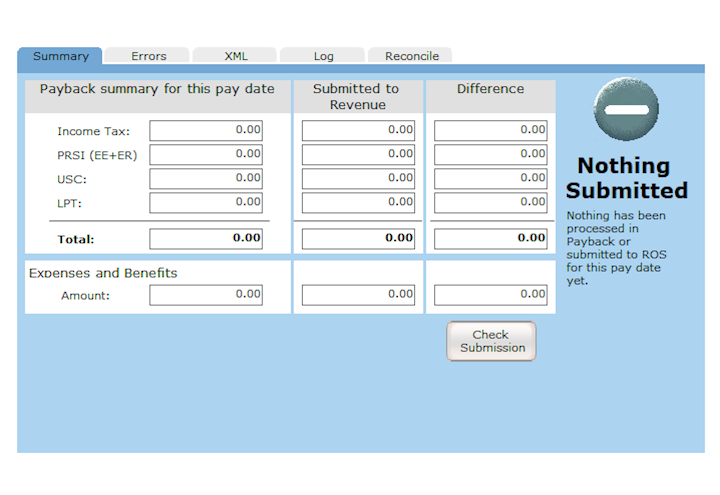 In this example, nothing has been submitted to Revenue and nothing has yet been processed in Payback for the selected pay date and payment frequency.