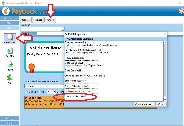 Checks to make sure that your password works with the digital certificate. If there is a problem with your certificate, please re-import it. If the problem persists, contact Revenue for a new digital certificate. The phone number for the National Employer's Helpline is Phone: 01 738 3638 or 1890 254 565