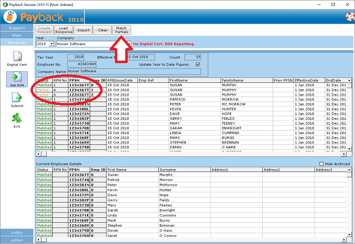 The Partial Match dialogue will appear. In it will be listed all of your employees who have more than one RPN available.