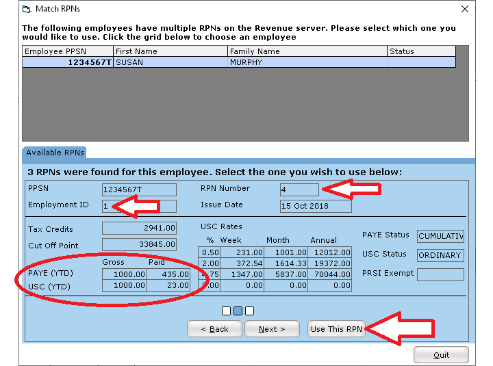 In the example opposite, Susan Murphy has three RPNs available on the Revenue server. She has an RPN for each of the three employment IDs of 0, 1 and 2