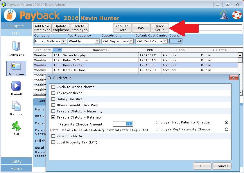 Step 2: Click the 'Quick Setup' button at the top of the screen and tick the 'Statutory Taxable Maternity' tick box in the Quick Setup screen.