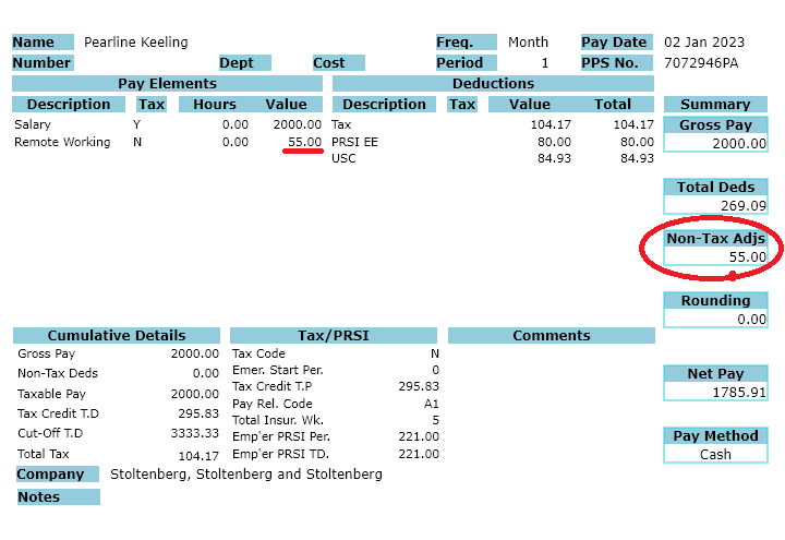 The pay slip will look like the one opposite. Note that the total expenses amount is added onto 'Non-tax Adjustments' so that the employee can be reimbursed.