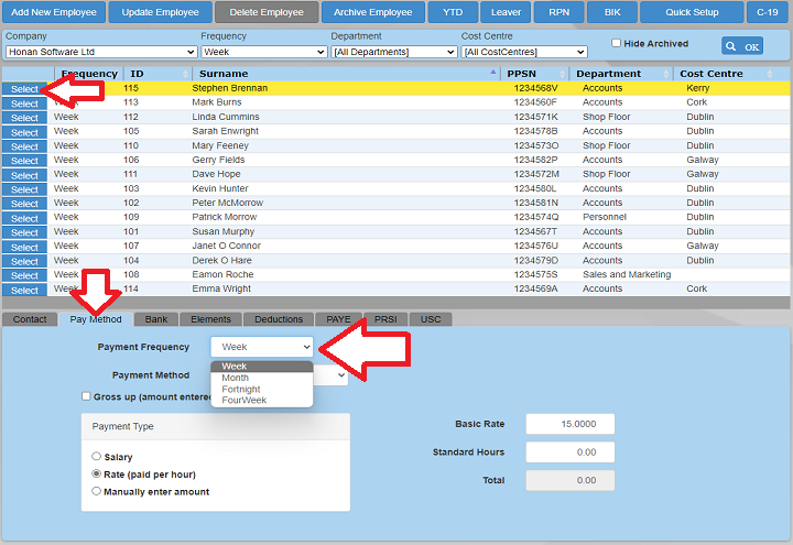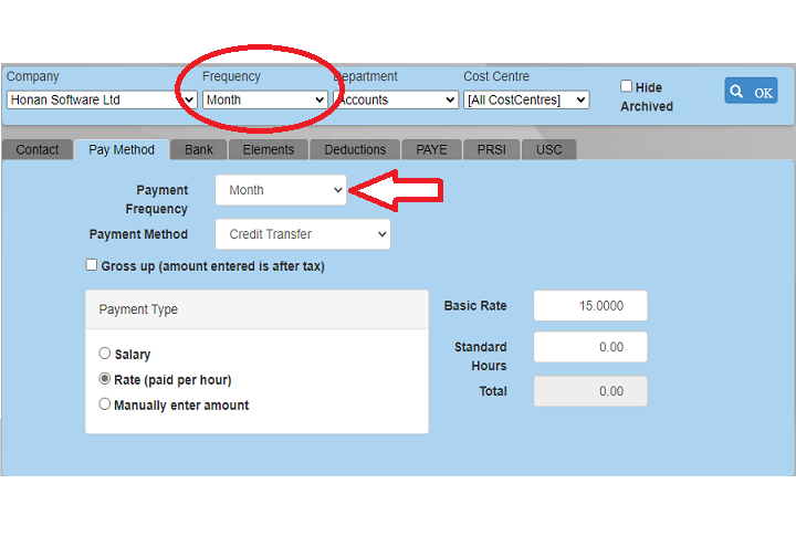 Here you will see a drop down with all the payment frequencies listed that you previously set up in the Company screen. Select the appropriate payment frequency and update the employee.