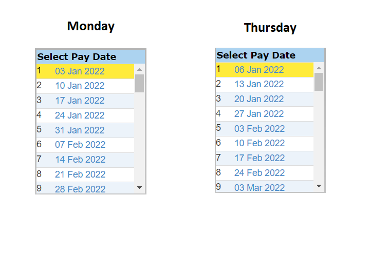 Note that the calendar dates (opposite) change when the pay day has been changed. This means that once the pay day has been changed to Thursday, it is not possible to select the Monday pay dates in the calendar.