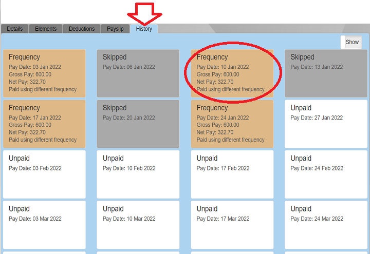 For example, if you change payment frequency from Weekly to Fortnightly, but keep the pay day the same (eg Thursday). The old weekly submissions still will not appear even though the pay date may coincide. It works this way because of the way Revenue designed their system. Each submission has an associated payment frequency.