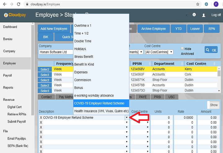 Select the element 'COVID-19 Employer Refund Scheme' from the drop down. Note that the PAYE, PRSI and USC tick boxes are all unticked.