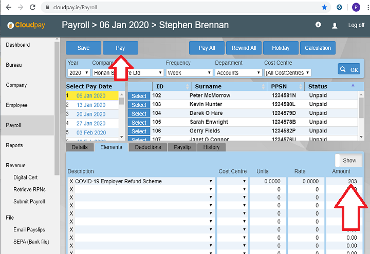 In the Payroll screen, type the amount of COVID-19 Refund scheme payment you wish to pay. Note that this must be in multiples of €203.