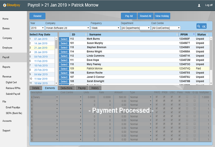 In this example the employee's leave date is 21 Jan 2019. Their last payment will be on 21 Jan 2019 and they will be getting €500.