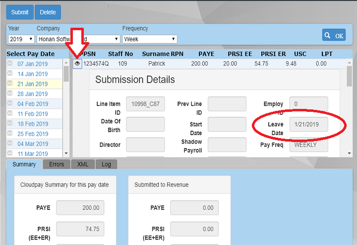 The leaver will appear in the Revenue Submission screen. If you click the the 'Eye' icon next to the employee's name, you can check that a leave date is included for them in the submission.