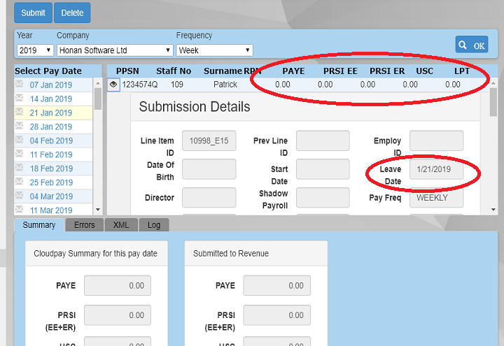 Select the submission date in the Revenue Submission screen. Note that the employee still appears, even though they did not have a payment processed for the selected pay date. They appear because the Include leaver in next payroll submission (Leave dates after 2018) option is ticked.
