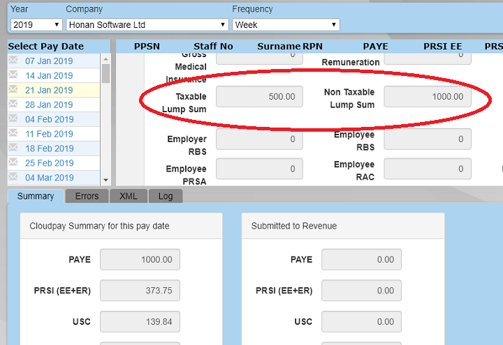 In this example the employee is getting a €500 taxable amount and also a €1000 non taxable amount in addition to their wages