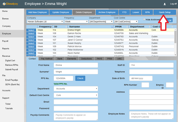 Select the Employee you wish to set up the PRSA for in the Employee Screen. At the top of the screen, click the Quick Setup button