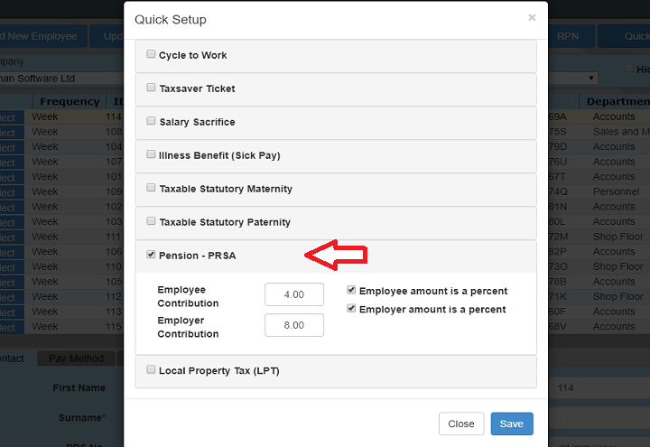 In the Quick Setup dialogue, click the tick box next to Pension - PRSA.