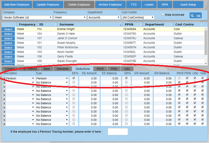 In CloudPay, you can set PRSAs up using the Quick Setup facility, or by entering the details directly into the deductions grid in the Employee screen.