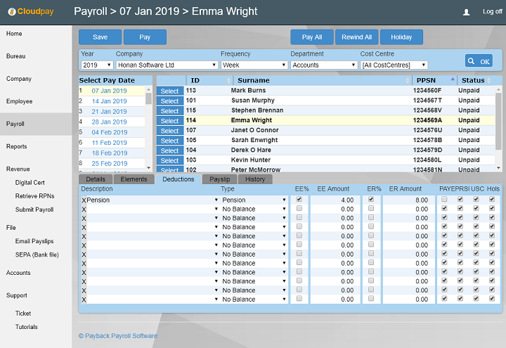 In the Payroll screen, note that the pension deduction now appears in the deduction grid for the Employee.