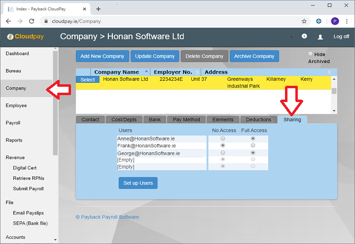 6. In the Company screen (https://www.cloudpay.ie/Company ) click on the 'Sharing' tab.