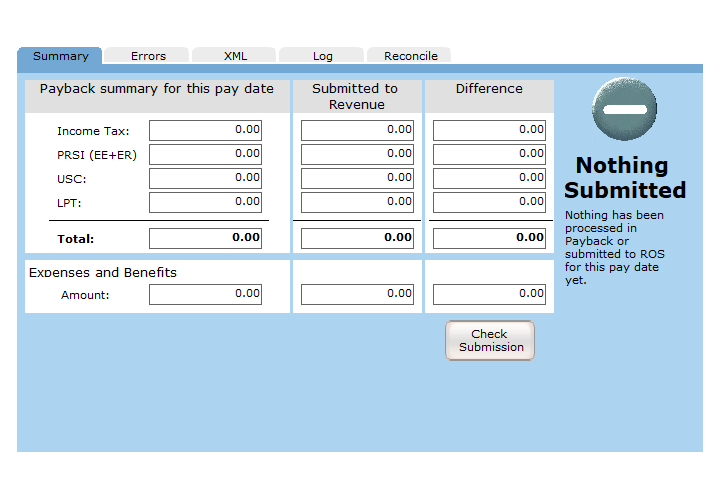 In this example, nothing has been submitted to Revenue and nothing has yet been processed in Payback for the selected pay date and payment frequency.