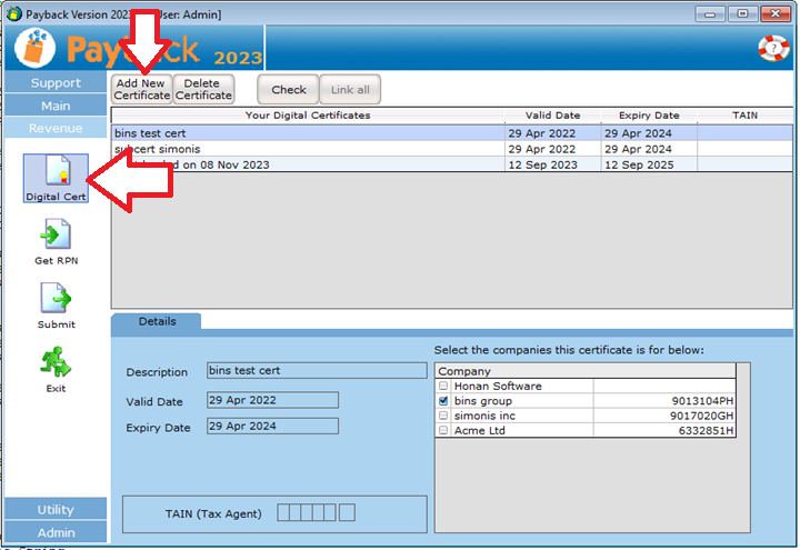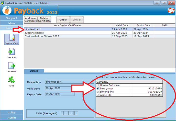 In the Digital Certificate Manager screen in Payback, select the Digital Certificate you loaded and make sure that your company, in the company list at the bottom of the screen, is ticked.
