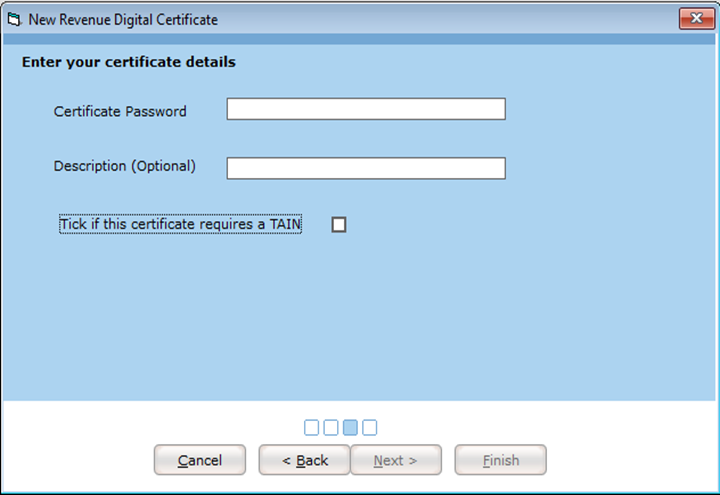 The Employer No. (found in the Contact Tab of the Company screen) Must be entered and be correct for the certificate to work. It is made up of seven numbers followed by one, or two letters. An example is 5266273H. Check the Password is correct. This is the same password you use to log into ROS.ie. Note that you may have recently changed this password, especially if Revenue have recently expired your certificate. If you are a Tax Agent and have a TAIN digital certificate, ensure that the TAIN is also correct, and that you have permission to access all of your clients in ROS.ie