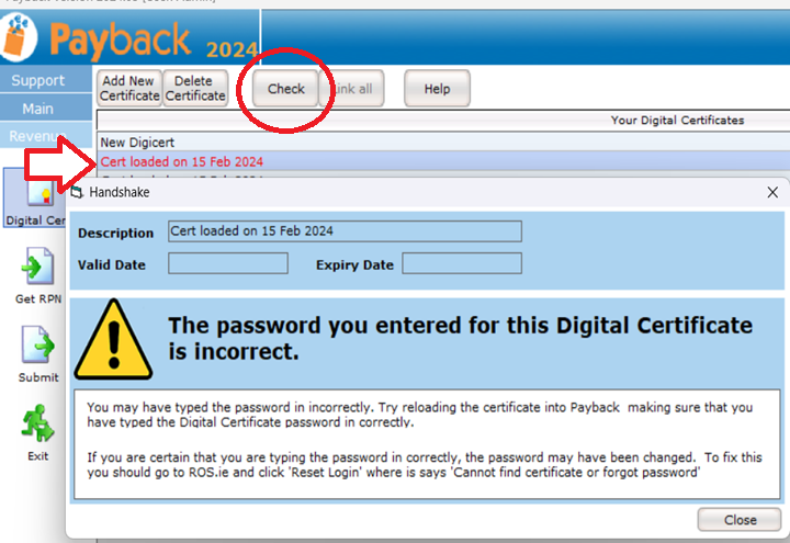 You will need to renew your digital certificate in ROS, download it, load it into Payback and allocate it in Payback to your company.