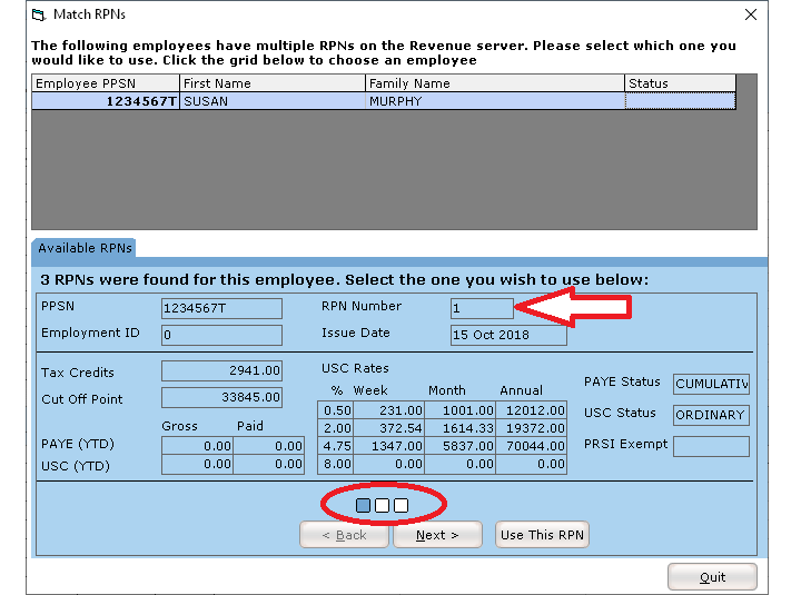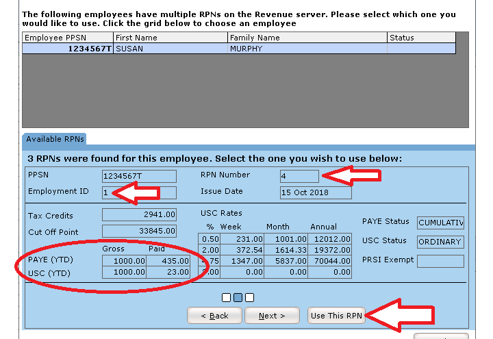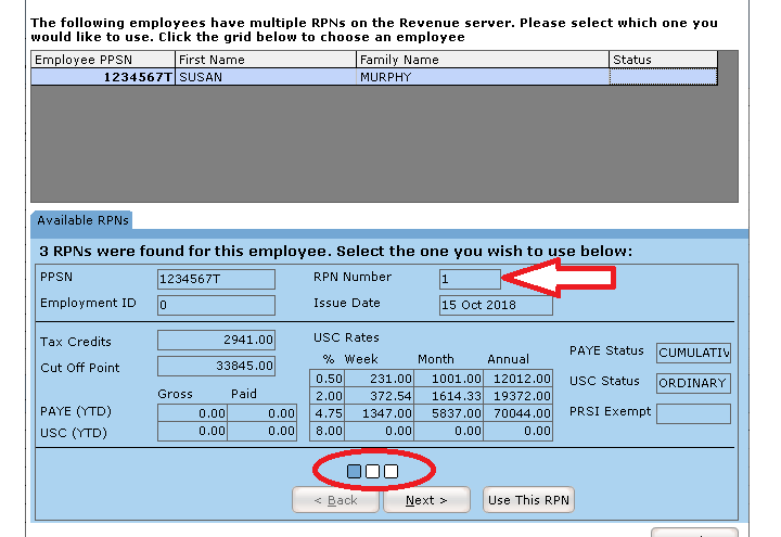 In the example opposite, Susan Murphy has three RPNs available on the Revenue server. She has an RPN for each of the three employment IDs of 0, 1 and 2