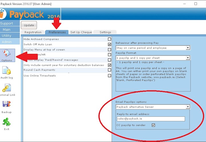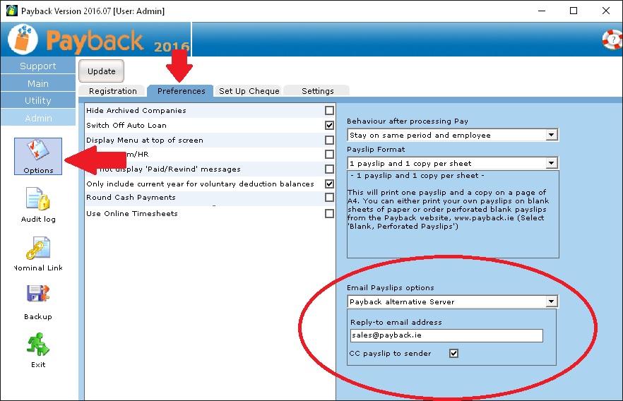 The first thing to do is set up the Mail Server you wish to use to email your payslips. To do this, click Admin on the menu at the left of the screen, then the Options Icon and select the Preferences tab. There is a choice of four different servers: