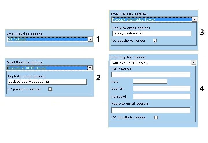 Option 2 is the Payback mailserver. We no longer recommend this option. The Payback mailserver gets an inordinate amount of spam. The result is that payslips emails frequently get bounced by recipient mailservers.