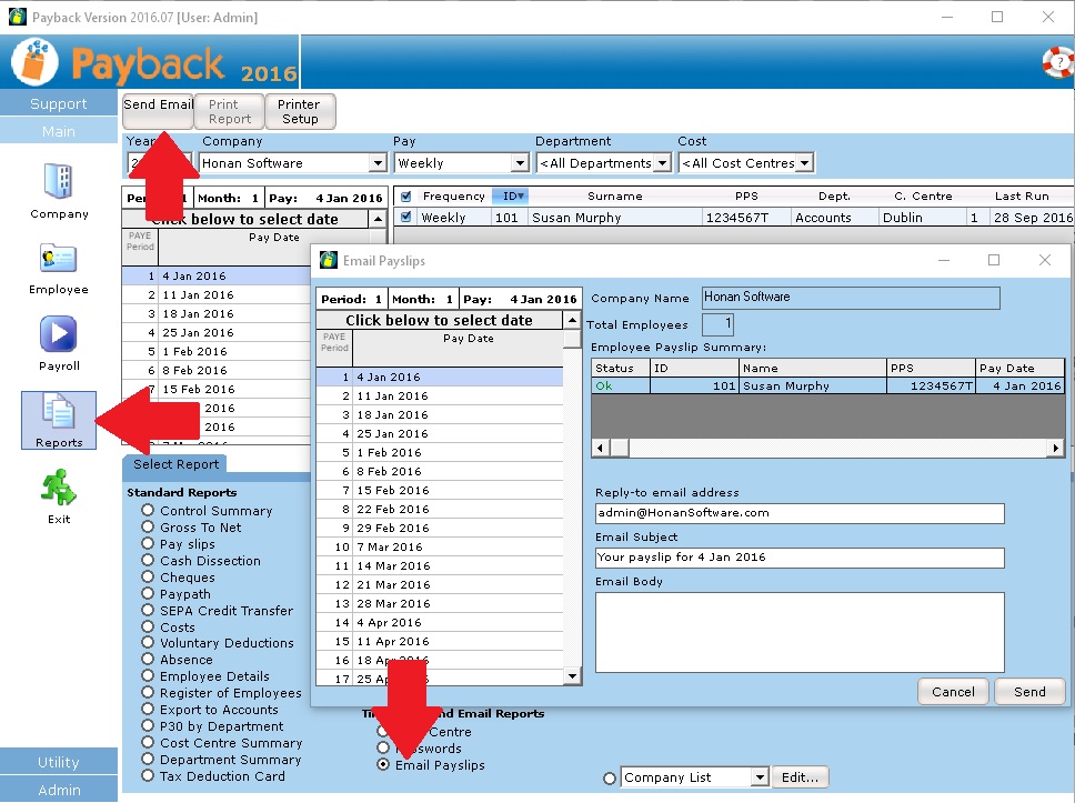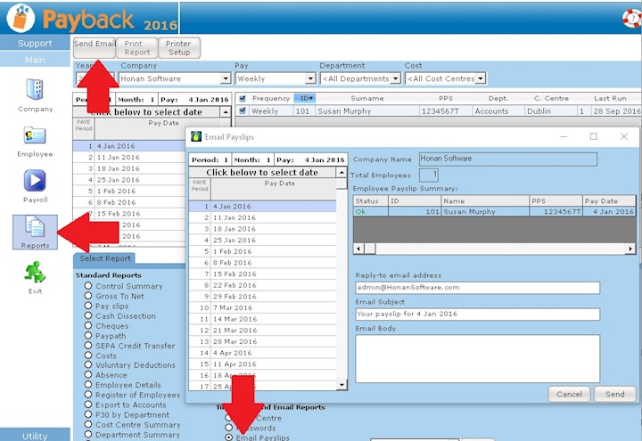 To send the payslips to your employees, click 'Reports' on the main menu and select the 'email payslips' report.